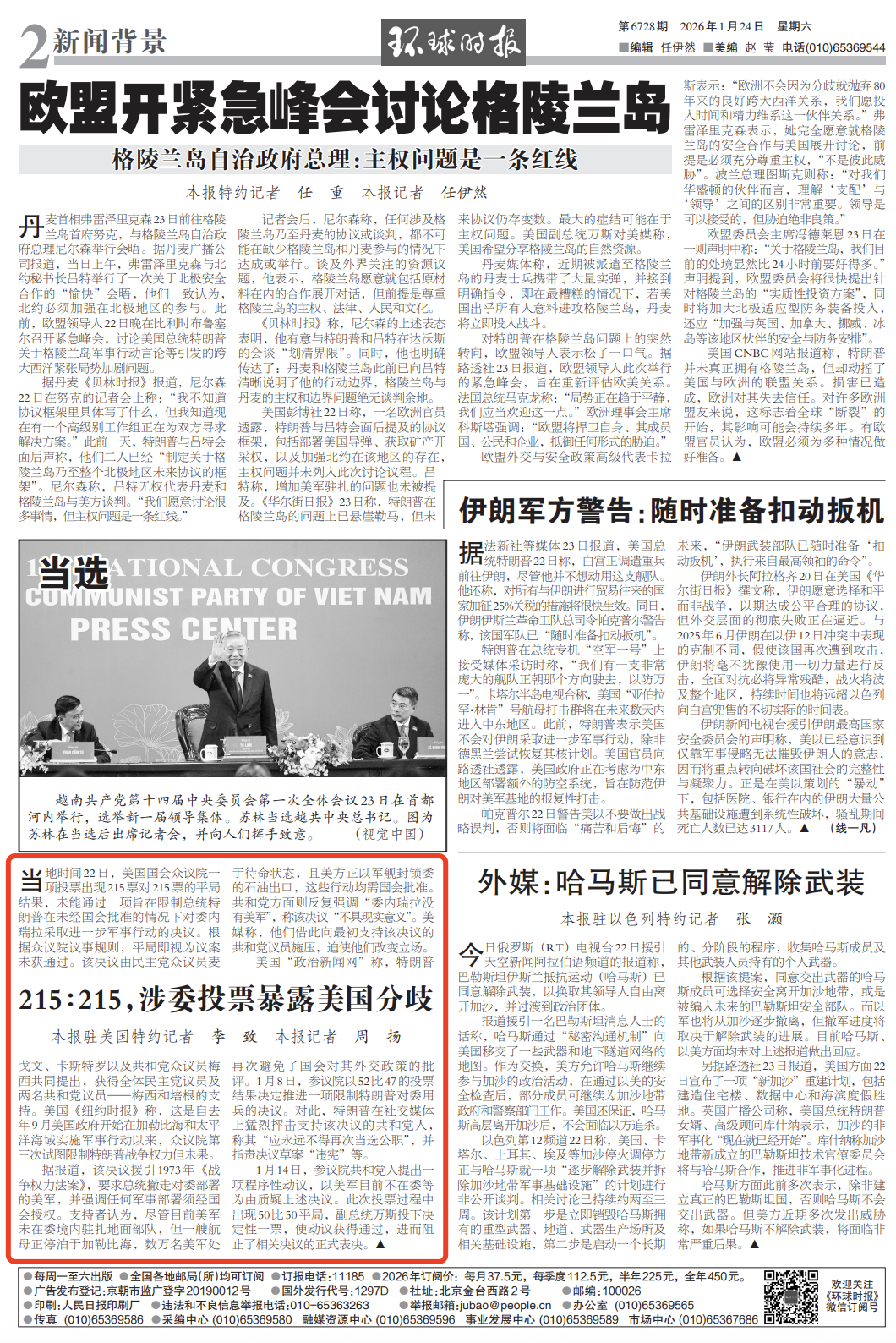 据报道,该决议援引1973年《战争权力法案》,要求总统撤走对委部署的美军,并强调任何军事部署须经国会授权。支持者认为,尽管目前美军未在委境内驻扎地面部队,但一艘航母正停泊于加勒比海,数万名美军处于待命状态,且美方正以军舰封锁委的石油出口,这些行动均需国会批准。共和党方面则反复强调“委内瑞拉没有美军”,称该决议“不具现实意义”。美媒称,他们借此向最初支持该决议的共和党议员施压,迫使他们改变立场。